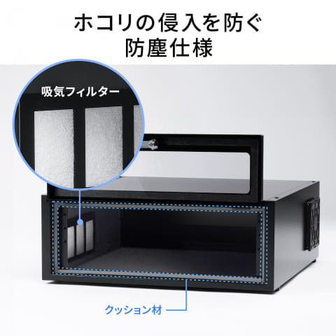 裏面には取り外し可能なケーブル口付きパネルを備え、上向きまたは下向きの配線が可能。高密度の吸気フィルターで外部からの粉塵を抑えるほか、扉まわりに備えるクッション材で密閉性を上げる。本体側面には放熱ファンを備える。