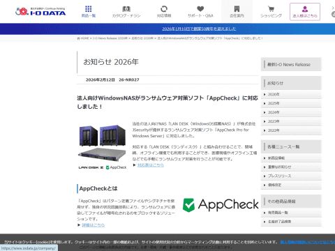株式会社アイ・オー・データ機器は、同社のNAS「LAN DISK」シリーズの法人向けWindows搭載モデルが、株式会社JSecurityの提供するランサムウェア対策ソフト「AppCheck Pro for Windows Server」に対応したと発表した。