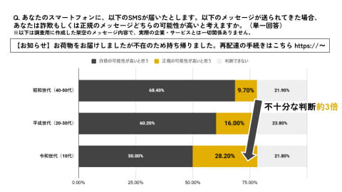 さらに、不在通知を装ったスミッシングのテストも実施。詐欺もしくは正規のメッセージか判断を求めたところ、「詐欺の可能性が高いと思う」と答えた割合は令和世代で50.00%、平成世代で60.20%、昭和世代で68.40%という結果になった。