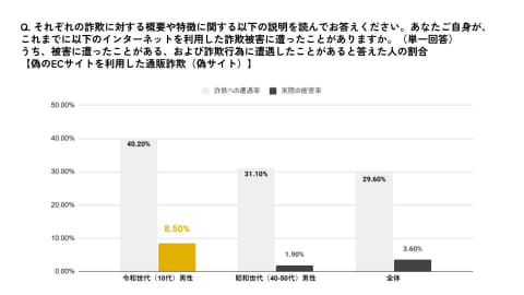 今回のアンケートでは、詐欺に対する認識能力を測るため、偽の通販サイトの画面を複数表示し、偽サイトかを判断させた。その結果、1つのテストにおける正答率は全体で38.3%、別のテストでは43.7%にとどまった。