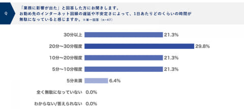 「業務に影響が出た」と回答した人に対して、1日あたりどのくらいの時間が無駄になっていると感じるかたずねたところ、21.3%が「30分以上」、29.8%が「20分~30分程度」と回答し、51.1%が「1日20分以上」の時間を無駄にしたと感じていることが明らかになった。
