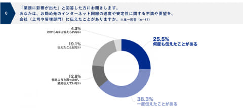 「業務に影響が出た」と回答した人に対して、インターネット回線の速度や安定性に関する不満や要望を会社に伝えたことがあるかたずねた質問では、25.5%が「何度も伝えたことがある」、38.3%が「一度伝えたことがある」と回答し、合計63.8%が「不満や改善要望を上司や管理部門に伝えたことがある」という結果になった。