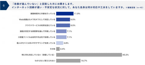 インターネット回線の改善が「進んでいない」と回答した人に対して、自身で行っている対応や工夫をたずねたところ、「特に何もしていない(我慢している)」が45.2%と最も多く、「業務時間外に作業を行う」が11.9%、「Web会議のカメラをオフにする」が9.5%と続いた。