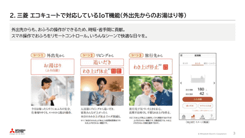 三菱電機 電材・住設家電事業部長の坂根司氏は、「エコキュートは、大気中の熱と電気エネルギーを使い、効率よくお湯を沸かす給湯機であり、家庭のエネルギー消費の約3分の1を占めている給湯での利用を高効率化でき、空気エネルギーを活用するため大気中へのCO₂排出量が少ないという特徴を持つ。ガス給湯器などと比較して給湯光熱費が割安であり、環境負担も少ないというメリットがある。すでに国内で1000万台の累計出荷がある」と説明。「仕事帰りや、買い物先から、スマホで湯はりができる。同時に脱衣所も暖かくしておける。離れて住む両親も、お湯の使用量と湯はりの利用状況を通じて見守ることができる。さらに、IoTとつながることで、再生可能エネルギーを昼間に使用するといった制御が可能になり、電力需要の平準化も可能になる。ネットワークにつながることで、エコキュートでできることが広がる」と述べた。