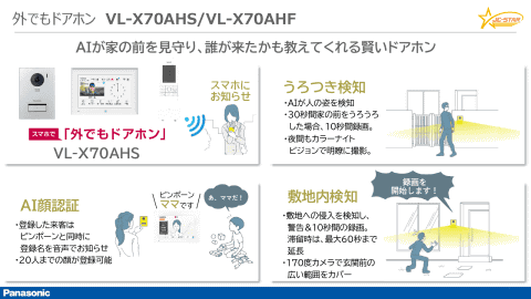 また、冷凍冷蔵庫の「NR-F65WX2」および「NR-F50HY2」、外でもドアホン「VL-X70AHS」および「VL-X70AHF」、HEMSコントローラ「AiSEG3」を紹介。「パナソニックは、家電、住設機器、空調機器までセキュリティに対応した製品を揃えている」と説明した。特に、「外でもドアホン」については、「2026年6月に発売する新製品であり、AIの搭載によって、登録している人の顔を認識して、『ピンポ~ン、ママです』と伝えたり、家の前をうろついている人がいたら録画を開始して通知したり、敷地内への侵入を検知すると『録画を開始します』と警告して、録画するといった機能を搭載している。ネットワーク接続とAIによって便利になった」と紹介。これを聞いた徳井氏は、「ドアホン周りこそ、セキュリティが大切。セキュリティ面で大丈夫であれば積極的に使いたい」と述べた。