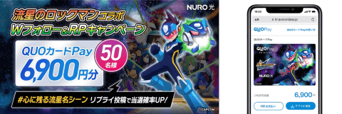 2つ目のキャンペーンは、NURO 光の新規申込者および利用者が対象。流星のロックマンオリジナルデザインQUOカードPay2600円分が抽選で69人にプレゼントされる。NURO 光アプリから応募フォームにアクセスして申し込む。