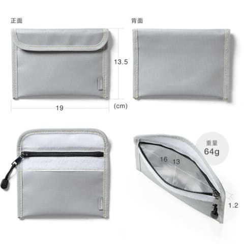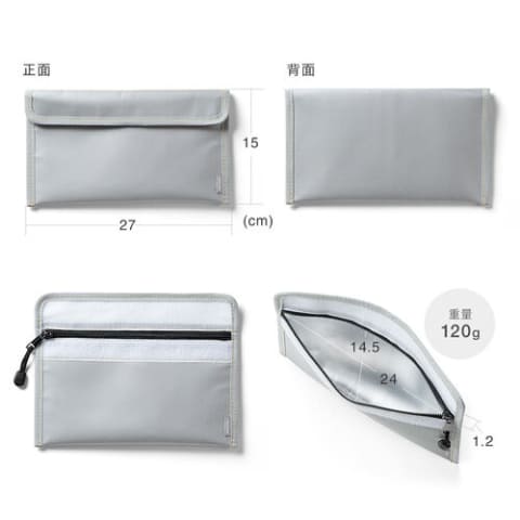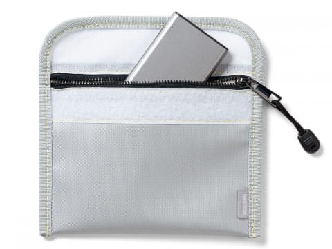 スリムな設計ながらモバイルバッテリー本体だけでなくケーブルなどの小物もまとめて保護できる。本体は火に強いほか、水を弾く撥水加工も施されている。