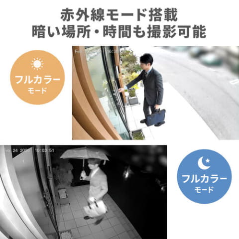 赤外線LEDと白色LEDを搭載し、夜間も監視可能。人感センサーを搭載し、人の動きを検知すると自動で録画を開始し、スマートフォンに通知する。