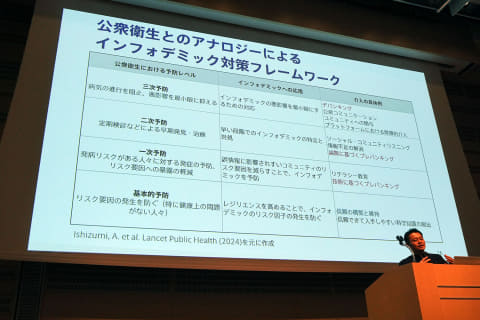 対して、プレバンキングはスケーラビリティが高い。ふたたび、偽・誤情報対策を感染症予防などの公衆衛生の取り組みに見立て、笹原教授は、デバンキングだけでなくプレバンキングも取り入れた、多層的な対策のイメージを示した。