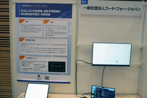 一般社団法人コード・フォー・ジャパンの取り組みは「SNSにおける偽情報・真偽不明情報の市民参加型可視化・分析技術」。Xのコミュニティノートを活用し、ダッシュボード上でコミュニティノートの時系列的な変化やナラティブ(言及内容など)を可視化する偽情報・真偽不明情報の検証ツール「BirdExplorer」を、2026年に一般のユーザーにも利用可能なかたちで提供することを目指している。