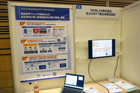 NABLAS株式会社およびNTT東日本株式会社の取り組みは「電話音声フェイク検知および自治体向け偽・誤情報総合対策の開発・実証」。テーマは2つ、技術としては3つが展示されていた。