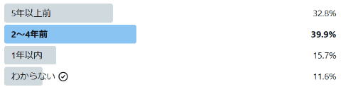 「無線ルーターを買い替えたのはいつ頃ですか?」との質問に1571件の回答があり、「5年以上前」が32.2%、「2~4年前」が39.9%、「1年以内」が15.7%という結果になった。機器・通信規格・セキュリティの寿命をすぎても使用している人が一定数いることが明らかになった一方で、半数以上が製品寿命の目安に沿って使用していることがわかった。