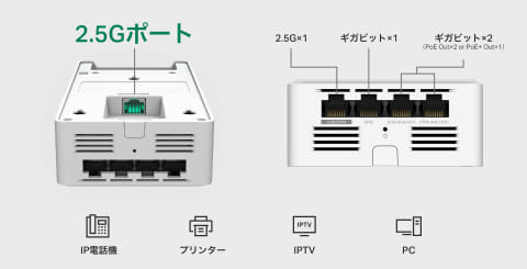 有線LANポートは、アップリンクポートとして2.5GbpsとPoE++受電(IEEE 802.3bt)対応×1、ダウンリンクポートとして2.5Gbps対応×1、ギガビット対応×3を備える。ギガビット対応のダウンリンクポートのうち2つはPoE給電(PoE×2またはPoE+×1)に対応する。