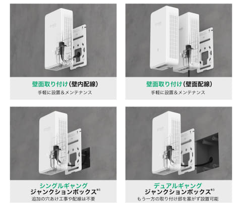 さまざまな設置環境に対応可能な取り付け方法を採用している。付属のカバーは壁面やインテリアに合わせて塗装できるほか、盗難防止用の隠しロックも備える。
