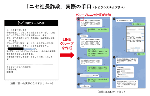 「ニセ社長詐欺」では、実在する企業の社長や役員になりすました人物からメールが届き、「業務に必要なのでLINEグループを作成するように」などと指示される。従うと、LINEのメッセージで法人の口座情報や口座残高を教えるように指示され、最終的に「今すぐ取引先に送金が必要」などの名目で指定の口座に送金するよう求められ、金銭をだまし取られる。