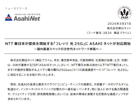 株式会社朝日ネットは3月31日、同社のISP「ASAHIネット」が、NTT東日本の提供する最大25Gbpsの光回線サービス「フレッツ 光25G」に対応したと発表した。
