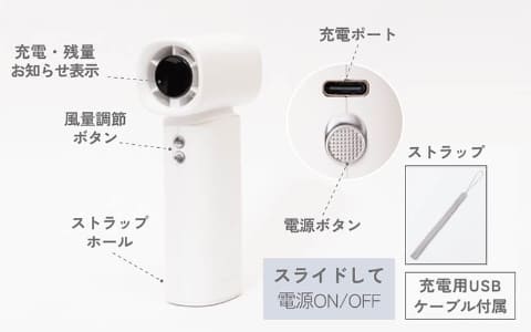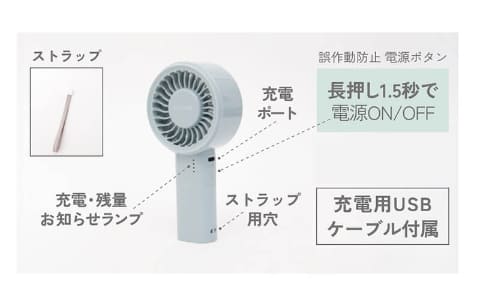 充電時間は約4時間で、連続動作時間は約1.5時間〜約7時間(満充電時)。風量は微弱・弱・中・強・最強の5段階で設定できる。充電の残量が一目でわかるランプが付いている。