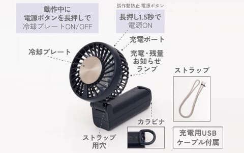 充電時間は約3時間で、連続動作時間は冷却プレートOFF時が約3時間〜約9.5時間、冷却プレートON時が約1時間〜約1.5時間(満充電時)。風量は弱・中・強の3段階で設定できる。充電の残量や冷却プレートの使用状況が一目でわかるランプが付いている。