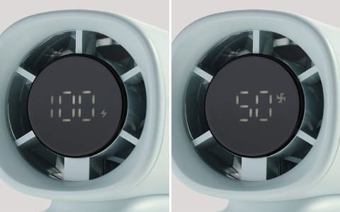 充電時間は約2時間で、連続動作時間は約2時間~約3時間(満充電時)。ファンの中心に充電の残量や風量が一目でわかるデジタル表示が付いており、風量は100段階の細かい調節が可能。