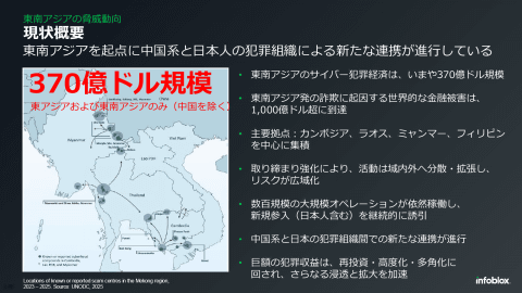 悪性ドメインを利用したオンライン詐欺やオンラインカジノなどのサイバー犯罪・サイバー脅威の東アジアおよび東南アジアの動向について、Infobloxのジョン・ヴォイチック氏(シニア脅威リサーチャー)が説明を行った。