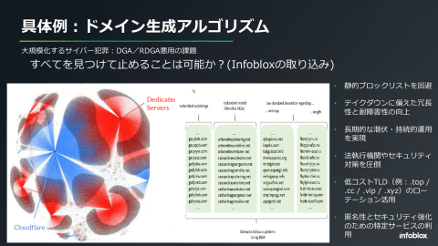 大量に登録されるドメインは、フィッシングサイトなど直接的なサイバー攻撃や、オンラインカジノのようなサイバー犯罪組織のビジネスに使われるほか、サイバー攻撃者にツールを提供するサイバー攻撃ビジネスの拠点としても使われる。Infobloxでは、悪性ドメインを特定して各国の法執行機関と協力してテイクダウンを目指す活動もしているが、攻撃者側も、冗長性や障害耐性を向上させたり、匿名性を強化したり、といった対策をとってくるという。