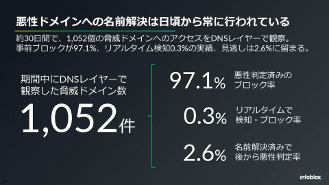 続いて、プロテクティブDNSの導入事例が紹介された。約30日間で1052個の悪性ドメインへのアクセスが観測された事例では、このうち97.1%を事前に悪性判定してブロックし、さらに0.3%をリアルタイム検知によりブロックした。2.6%は名前解決後に悪性と判定された。