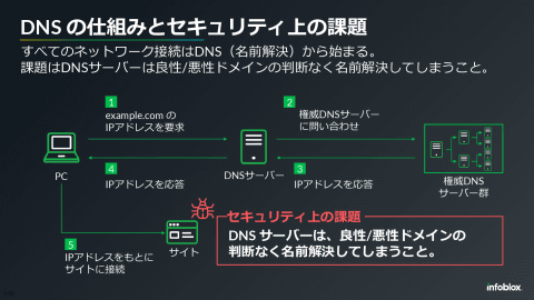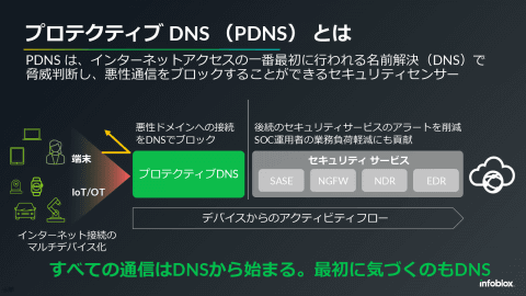 DNSは、ユーザーがアクセスするドメイン名をIPアドレスに変換する「名前解決」を行うが、この際、問題のない良性ドメインに対しても、フィッシングサイトなど悪性ドメインに対しても名前解決を行ってしまう。プロテクティブDNSは、ユーザーが悪性ドメインにアクセスしようとしている場合はこれをブロックし、アクセスさせないようにすることで、サイバー攻撃の被害を未然に防ぐ。