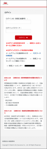 リンク先の偽サイトは、第一生命のログイン画面を装ったもので、ログインID(投信口座番号)、ログインパスワードの入力を求められる。
