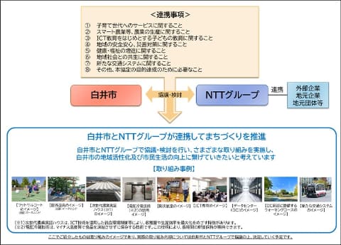 同プロジェクトの始動に合わせ、千葉県白井市とNTTグループ4社(NTTグローバルデータセンター・ジャパン株式会社、NTT東日本株式会社 千葉事業部、NTTアーバンソリューションズ株式会社、株式会社NTTアグリテクノロジー)は、「白井市の地域活性化に関する包括連携協定」を締結した。