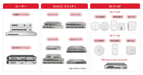 多機能ゲートウェイ、拠点統合ゲートウェイといったルーター、L1/L2/L3スイッチ、Wi-Fi 6/7対応アクセスポイントを中心としたネットワーク機器が体系的に提供される。機器の設定やソフト更新、稼働状況の確認は、一元管理システムの「eKit APP/SNC」や「Easy WEB」の管理画面から行える。