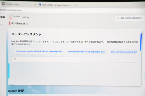 AI機能として特徴的なのが「ルーターアシスタント」と呼ばれる機能で、テキストボックスに自然言語でトラブルの内容や変更したい設定内容を書くことで、適切な設定項目を示してくれる。このチャットAIはローカルで動作するため、インターネット接続のセットアップ前などのオフライン環境でも利用できるのが特徴だ。