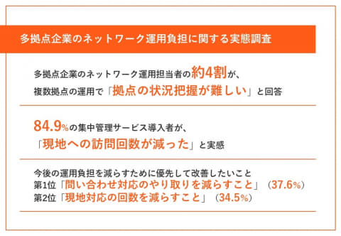 同社は今回の調査結果から、多拠点企業のネットワーク運用において拠点の可視化とトラブル対応の迅速化・効率化が共通の課題であることが明らかになったとした。集中管理サービスの導入により現地対応の負担軽減は進んでいるものの、管理面、サポート面、費用面の課題が残っているとし、今後さらにトラブル発生時の原因特定を迅速化する環境づくりが求められるとしている。