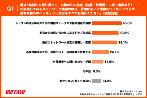 直近2年以内のネットワーク機器の保守・管理において、実際に行ったトラブルや通常業務外のイレギュラー対応をたずねた質問では、「トラブルの原因特定のための機器ステータスや接続情報の確認」が45.8%、「拠点からの問い合わせによるトラブル対応」が40.9%、「拠点のネットワーク設定の見直し・変更」が39.1%という結果になった。