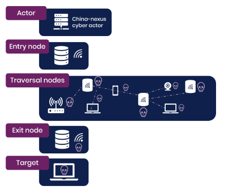 中国政府と関連があるとされる攻撃グループ「Volt Typhoon」「Flax Typhoon」は、Raptor Trainを低コスト・低リスクで匿名性が高い通信経路として、攻撃先のスキャンから、マルウェアの配信、窃取したデータの流出まで、サイバー攻撃のあらゆる段階で悪用しているという。正規のユーザーも利用していることから、悪意のある活動の帰属を特定することが難しくなっている。かつてVolt Typhoonが使用し、2024年のはじめに米国により機能停止させられた「KV Botnet」は、主に脆弱なCiscoおよびNETGEARのルーターで構成されていたという。
