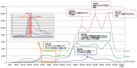 | 「BuzzMetrics」による調査データ例。トヨタの新型ハイブリッドカー「プリウス」と、ホンダのハイブリッドカー「インサイト」を対象とした口コミ件数のトレンド |