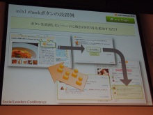 楽天株式会社常務執行役員の中島謙一郎氏は、「楽天市場」「楽天GORA」「楽天ブックス」「楽天トラベル」「楽天デリバリー」の5つのサービスに、「mixiチェック」との連携機能を導入したことを説明。「mixiチェックのように、友人との間で『これを買ったよ』といった情報を共有するソーシャルマーケティングが、今後重要なキーワードになる。ウェブ検索は既にあるニーズを満たすものだが、ソーシャルマーケティングはこれまで無かったニーズを創出できる」とコメントした。