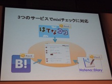 | 「楽天市場」「楽天トラベル」など5サービスがmixiチェックに対応 | 「はてなブックマーク」「はてなダイアリー」「はてなココ」がmixiチェックに対応 |