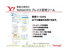 事業主向けの機能としては、Yahoo!ロコ内に無料で「Yahoo!ロコ プレイスページ」を簡単に作成できるサービスを提供。Yahoo!ロコのプレイス管理ツールでは、ホームページ作成機能のほか、おすすめ情報発信機能、クチコミ返信機能、クーポン/スタンプ発行機能、アクセスレポート機能などが利用できる。