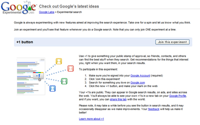 現時点で「+1」ボタンは英語版のGoogle.comのごくわずかなユーザーにしか表示されておらず、徐々に表示範囲を拡大していく。ただし、Google Labsの「Experimental Search」からオプトインすることで参加することも可能だ。「+1」ボタンはすべての検索結果とAdWords広告、また将来的には一般のウェブページにも表示できるようにする計画だ。