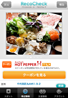 株式会社リクルートは21日、位置情報を友人同士で共有できるiPhone/Android向けアプリ「RecoCheck(レコチェック)」をバージョンアップした。「ホットペッパーグルメ」など同社のサイトに掲載されているクーポンや口コミが表示されるようになった。