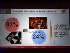 続いて、日本はブロードバンドのインフラでは世界一だが、インターネットの利活用では世界で16位に甘んじているというデータを紹介。さらに、日本では99.7%が中小企業だが、サイトを持つ中小企業は24%に過ぎず、ネットで情報を提供していないことによる機会損失は非常に大きいのではないかとして「インフラはあるわけだから、まだまだ日本にはネットを活用する余地があるということ」と指摘した。