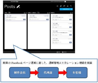sociobridgeは、Facebookページへの投稿管理、投稿内容監視、カスタムタブ作成などの機能を備えるFacebookページの運用統合管理ツール。マイクロソフトとDRFが開発支援を行い、株式会社リード・レックスが開発した。初期設定費用は8万5000円、月額8万5000円~。