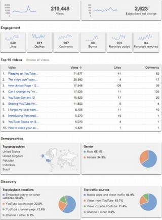 YouTube Analyticsで特徴的な新機能は、ログインすると表示される概要レポートだ。このレポートでは、さまざまなグラフによって投稿した動画に関する統計情報を一覧できる。視聴者数の多い動画トップ10、また視聴者のデモグラフィックス、視聴地域などが折れ線グラフや円グラフ、地図などによってわかりやすく表示される。