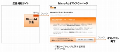 まず、マイクロアドが配信する広告の表示領域内に、オプトアウトページへリンクする「ラベル」をわかりやすく表示する。閲覧者はこれをクリックすることで、同社の行動ターゲティング広告の説明ページへジャンプ。そこでオプトアウトボタンをクリックすれば、Cookieが無効化され、行動履歴に基づく広告配信がされなくなる。具体的な導入時期は確定次第、告知する。