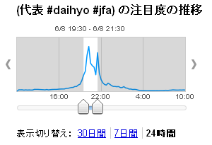 例えば、サッカーW杯アジア最終予選に関するツイートを「代表 #daihyo #jfa」で検索を行った結果のグラフを見ると、6月8日に行われた日本対ヨルダン戦では、キックオフの19時半から急激にツイート件数が伸び、得点を重ねた前半時点でピークを迎えたことがわかる。一方、6月12日の日本対オーストラリア戦では、得点に動きがあった後半にスイート件数が伸びている。