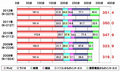 内訳は、テレビが161.4分、ラジオが31.9分、新聞が24.0分、雑誌が16.6分、PCからのインターネットが77.1分、携帯電話(スマートフォンを含む)からのインターネットが40.4分。携帯電話からのインターネットが2011年の32.0分から増加した一方で、PCからのインターネットは81.7分から減少した。「スマートフォンの普及によるモバイルへのシフトが進んでいることが伺える」としている。なお、インターネットはサイト閲覧のほか、メールも含まれる。