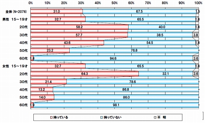 調査は今年2月、RDD方式で抽出した東京都、大阪府、愛知県、高知県の15~69歳の個人を対象に郵送で実施。東京659人、大阪666人、愛知676人、高知650人の計2652人から得た回答に対して、2011年度住民基本台帳に基づく性年代によるウェイトバックをかけて算出している。