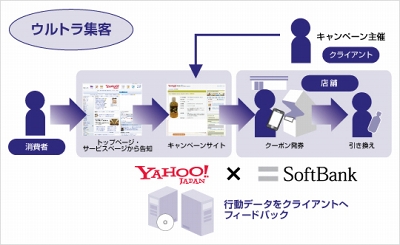 ソフトバンクテレコム株式会社がO2O(Online to Offline)事業でヤフー株式会社と協業し、「ウルトラ集客」サービスを23日より開始した。ポータルサイト「Yahoo! JAPAN」上で広告主企業の商品・サービスなどを大量告知してクーポン情報を提供、リアル店舗の集客と販売拡大につなげるもの。
