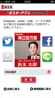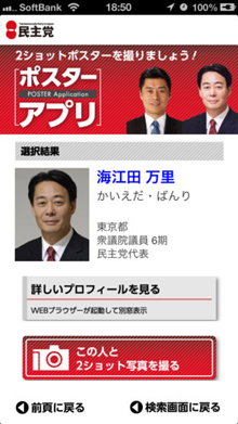民主党は8日、海江田代表や細野幹事長らとのツーショットポスターが撮影できるスマートフォン向け「ポスターアプリ」を公開したと発表した。App StoreおよびGoogle Playから無料でダウンロードできる。
