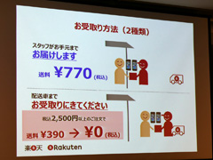 楽天では、基本的にBtoBtoCモデルとして、事業者を間に挟んでユーザーにサービス提供しているが、楽びん!では楽天が直接商品の調達から配送まで行う。中西氏は「新しいサービスであり、BtoBtoCあるいはBtoCといった形態にこだわらず、ユーザー目線でサービスを提供したい」としており、エリアの拡大や取扱商品の拡充といったタームに合わせて事業モデルも修正するとしている。